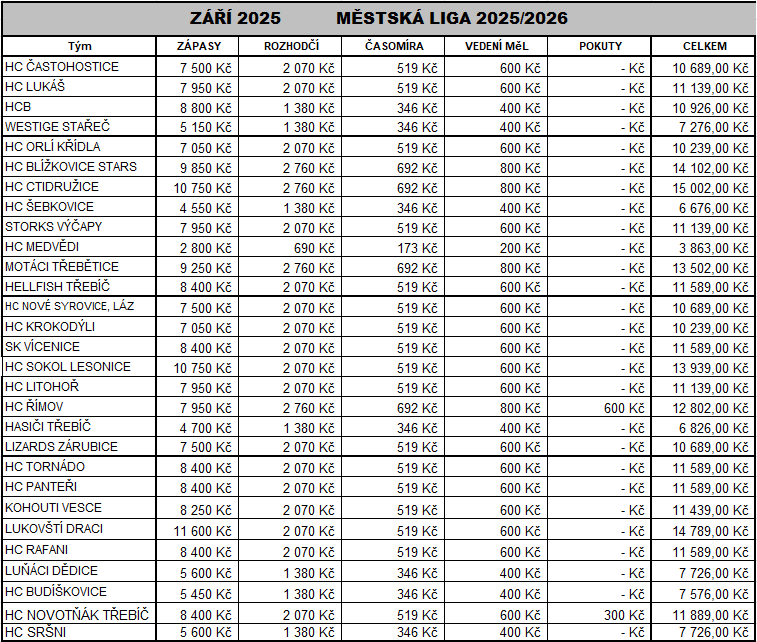 Platby za Městskou ligu září 2025